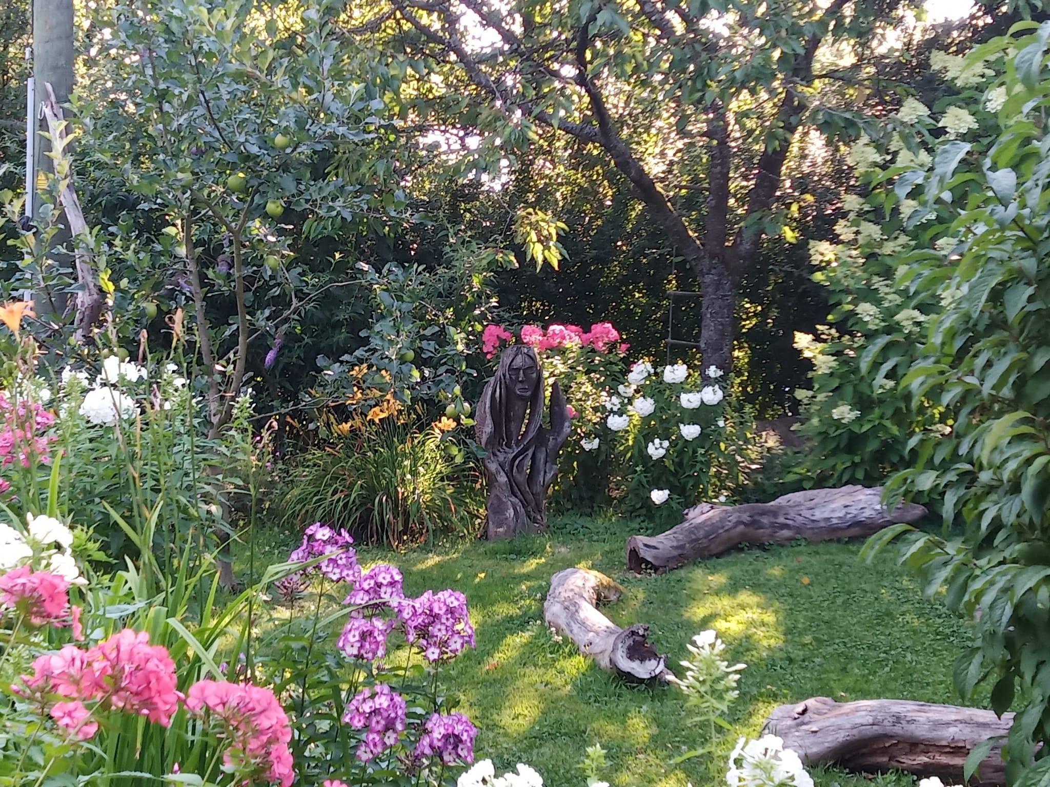 Das Haus selbst umgibt ein von Hecken und hohen Bäumen eingefasster Garten. Nicht nur die Vögel lieben ihn. Blumen und Kräuter finden ihre Plätze und dürfen wachsen. Baumwurzeln recken sich in die Luft. Abgestorbene Äste und Stämme verwandeln sich in geheimnisvolle Wesen und blicken neugierig umher. Eine Indianerin wacht über die Feuerstelle.