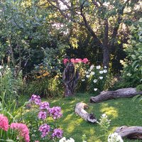 Das Haus selbst umgibt ein von Hecken und hohen Bäumen eingefasster Garten. Nicht nur die Vögel lieben ihn. Blumen und Kräuter finden ihre Plätze und dürfen wachsen. Baumwurzeln recken sich in die Luft. Abgestorbene Äste und Stämme verwandeln sich in geheimnisvolle Wesen und blicken neugierig umher. Eine Indianerin wacht über die Feuerstelle.